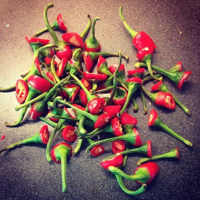 – 1 hot chili of your choice per 5 peppers, halved and seeds removed
